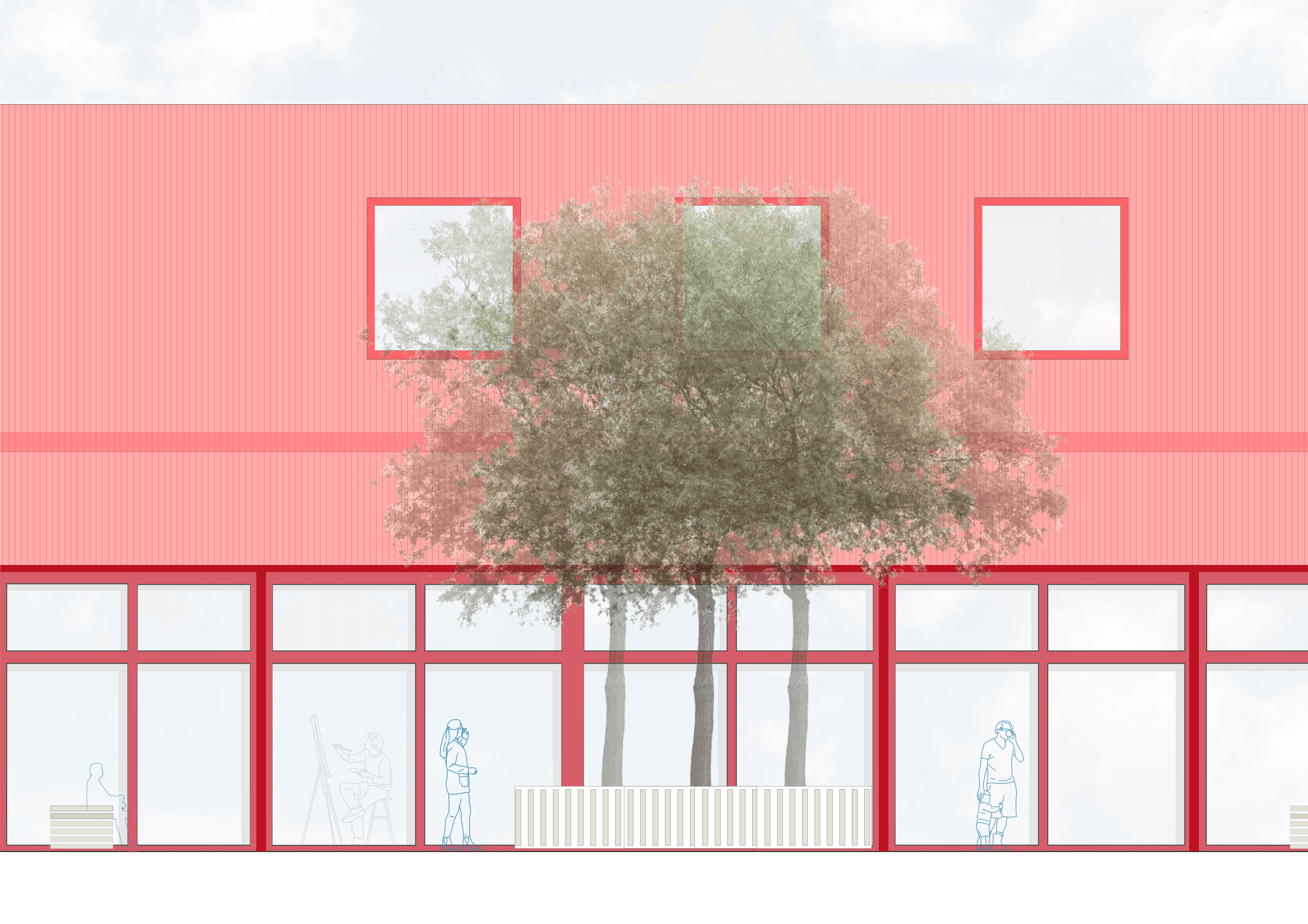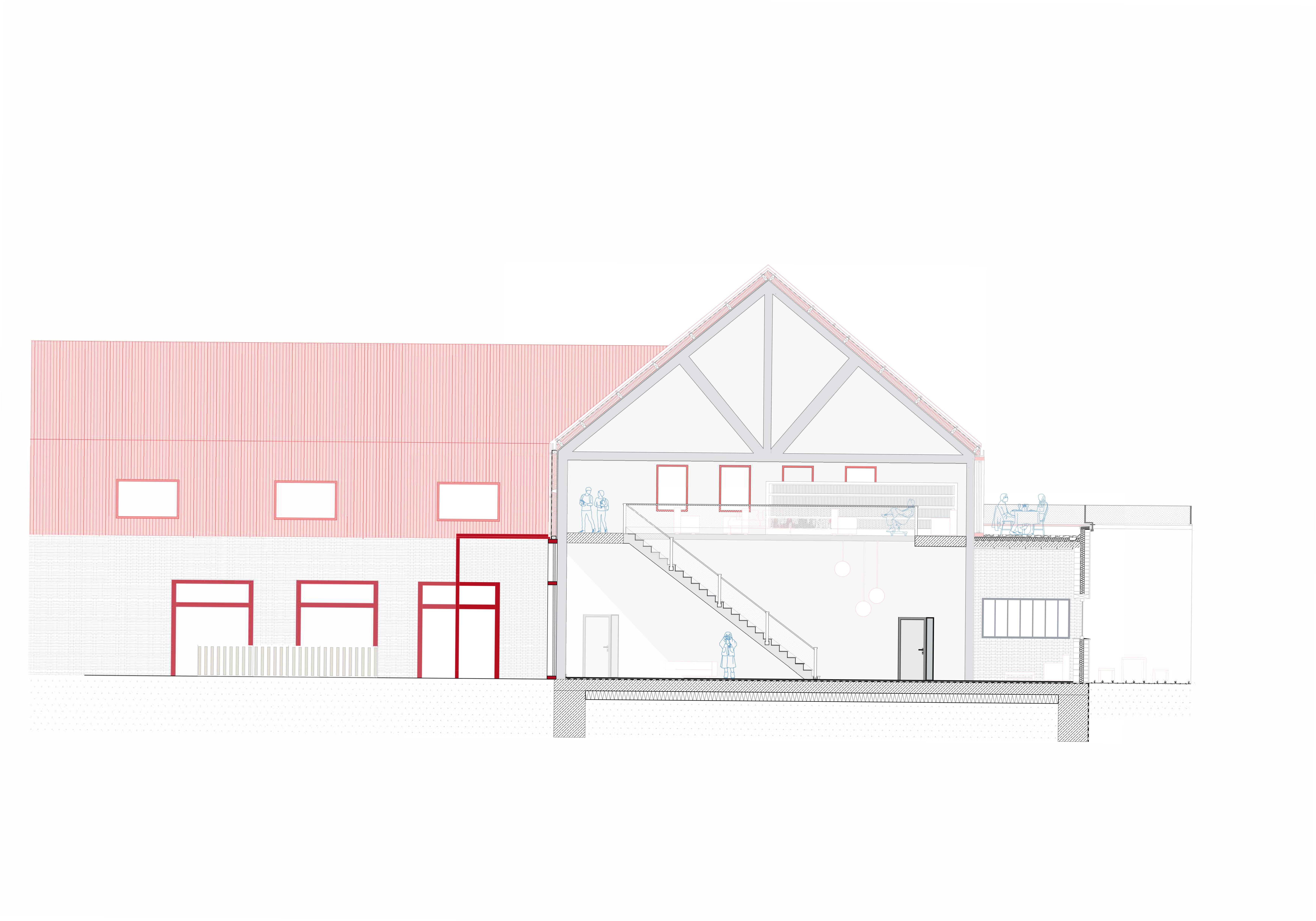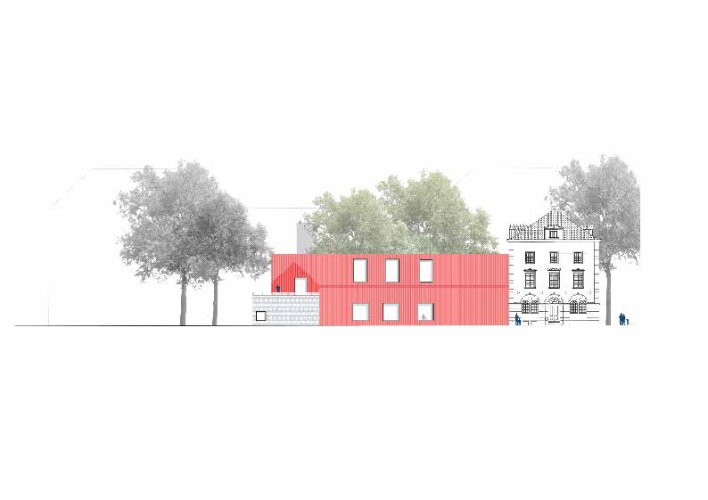 The facade of the renovated building, with its gable roof, blends in with the surrounding buildings, but its striking red color makes it stand out, recalling the building's former use.
