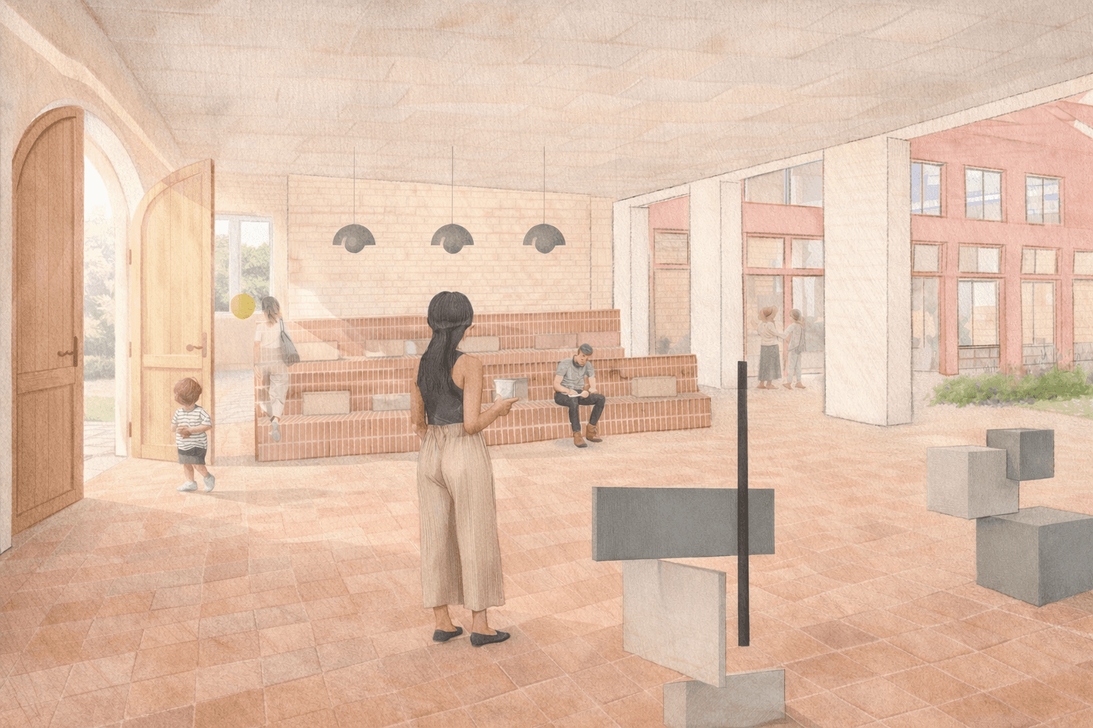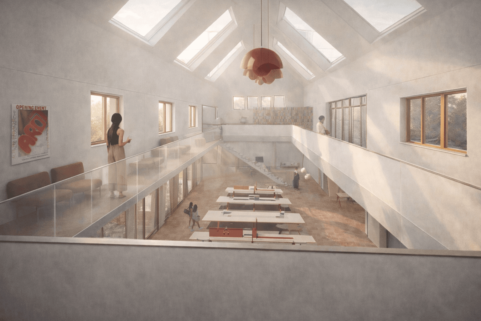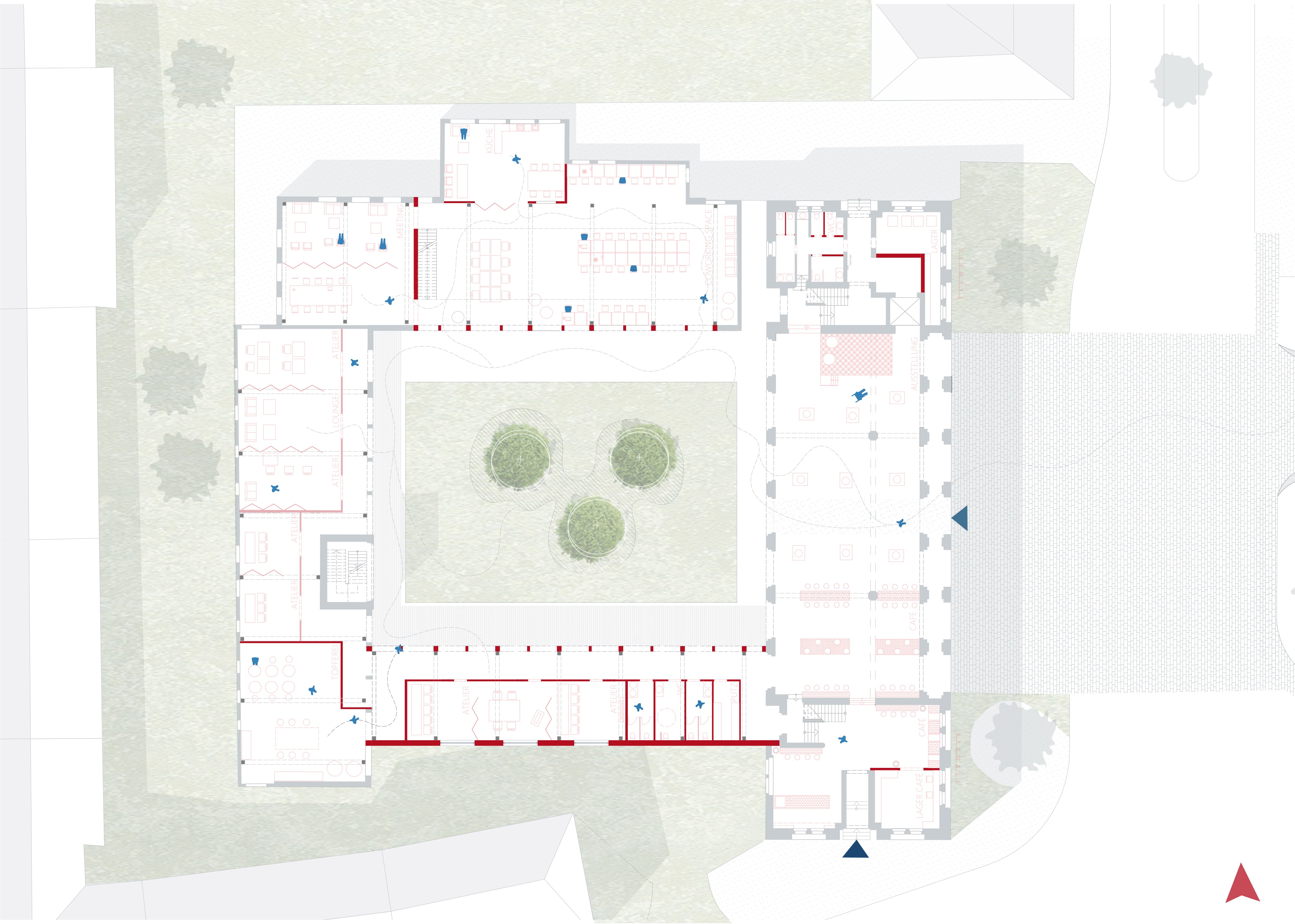 This includes flexible studios, co-working spaces, a library, and meeting spaces on the ground floor and first floor.