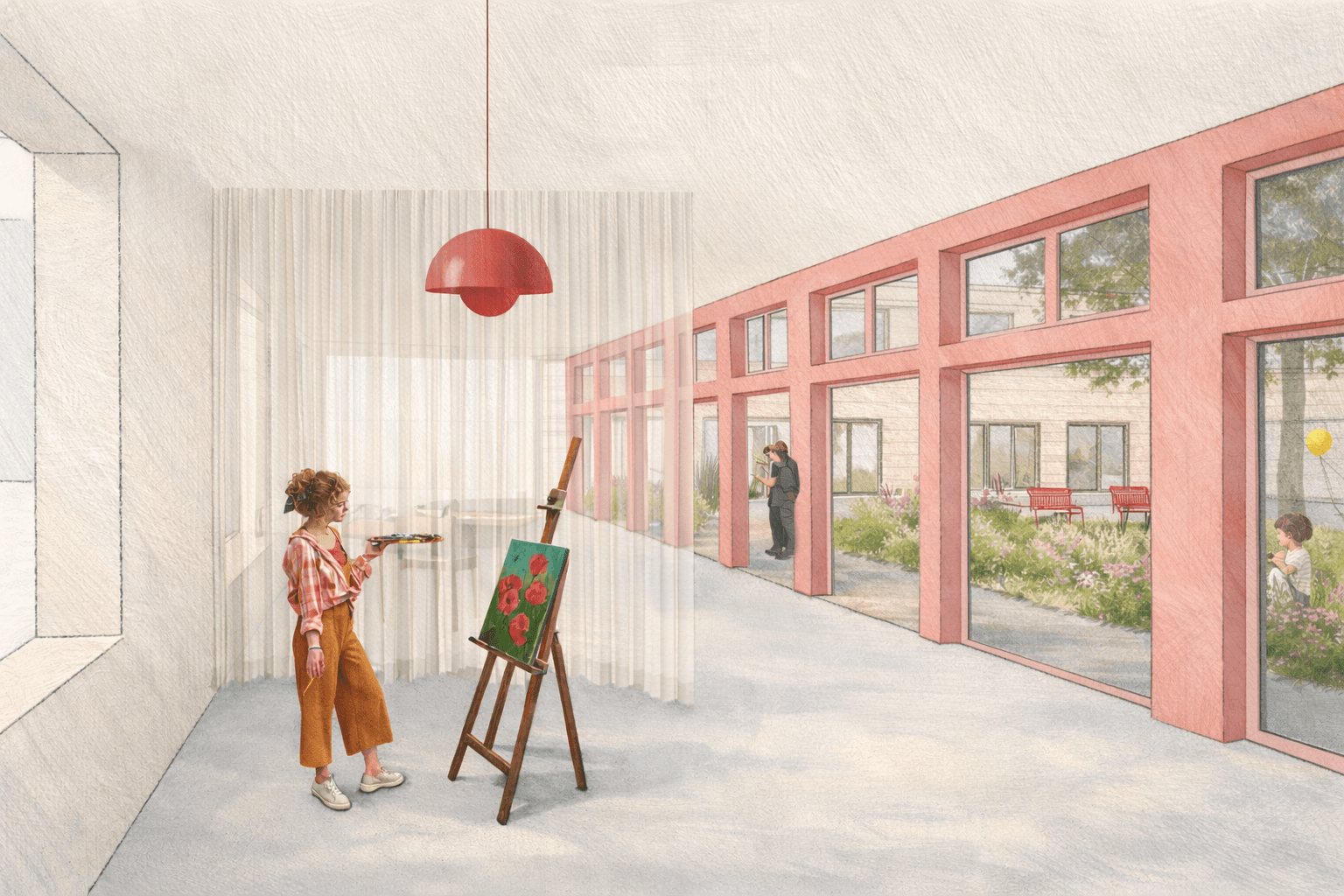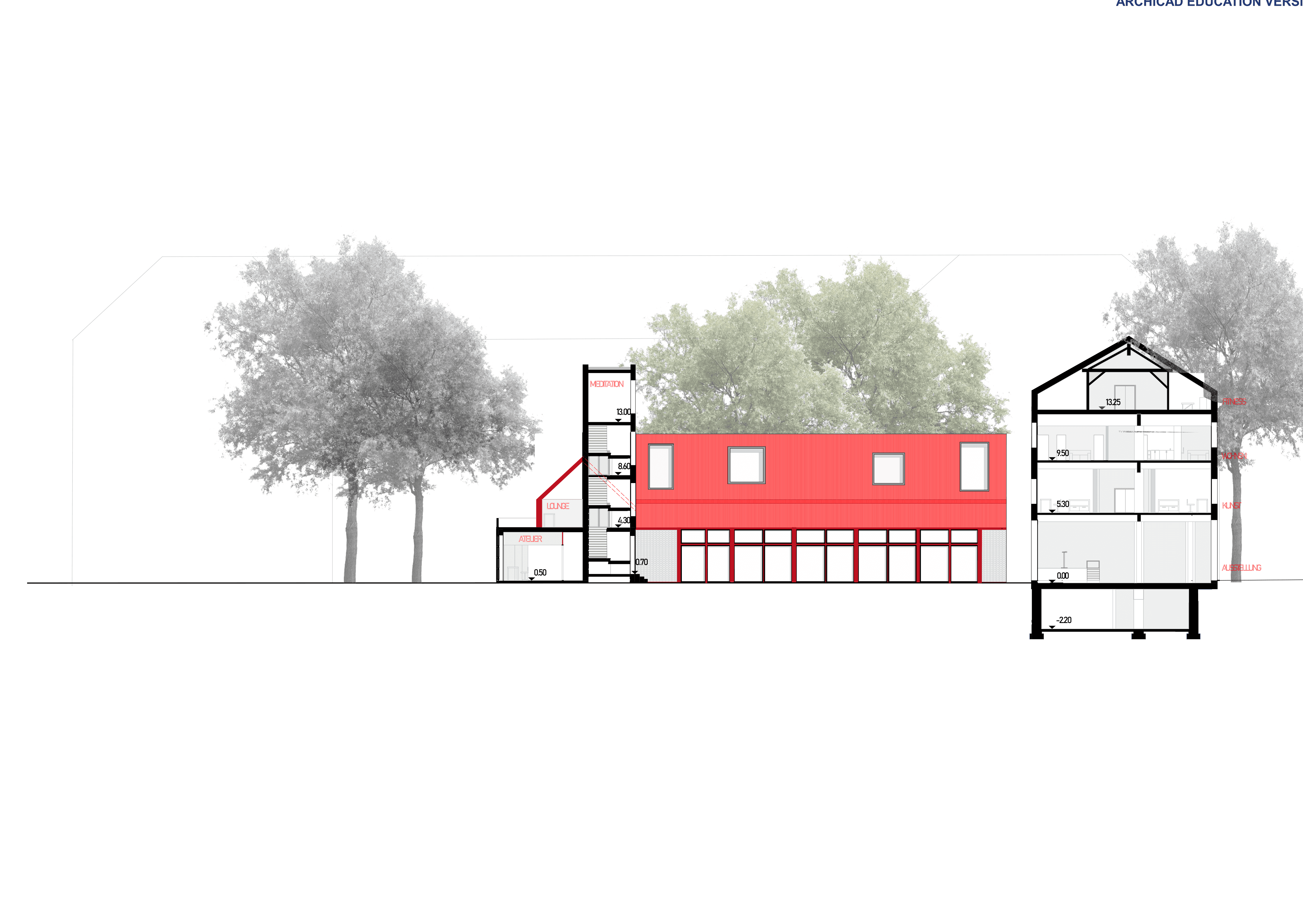 Through its conversion into a space for art, living, and culture, the building is now accessible to the public. Creative courses such as pottery, drawing, and dance, as well as continuing education programs, evening events, and lectures, make this possible.